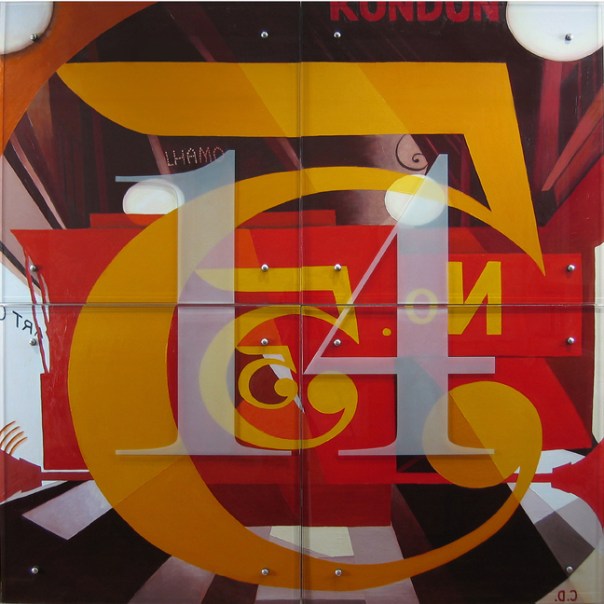 Over the gold “5” that in Demuth’s painting represents Fire Engine No. 5 clanging down a Manhattan street in Williams’ poem, I layered on a big number 14 (1+4=5) sandblasted on glass. (The current Dalai Lama is the 14th re-incarnation of the Tibetan Buddhist leader.) I pushed the colors toward the saffron and burgundy red associated with Buddhist monks. Then I replaced William and Bill with the Dalai Lama’s various names, Kundun and Lhamo.