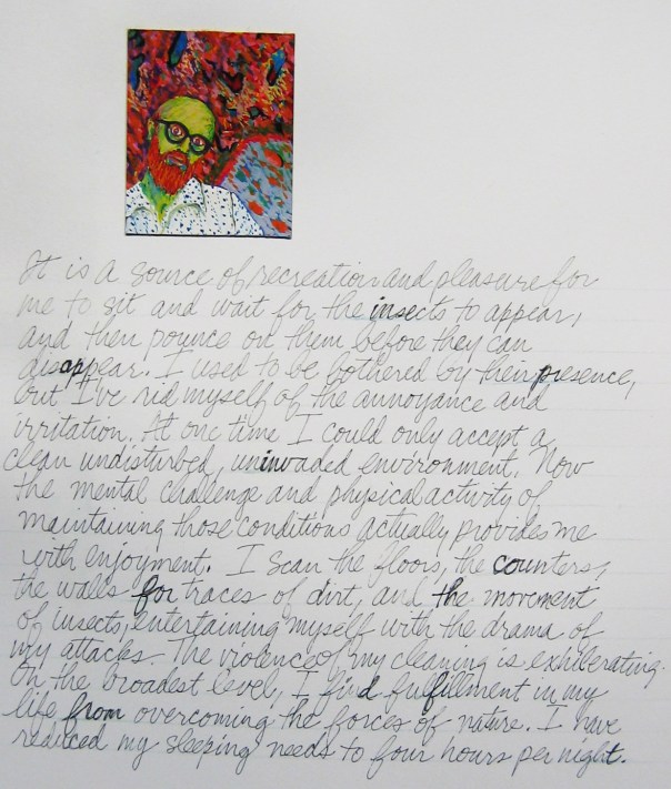 As I continued repainting machine photo after machine photo, I found myself morphing into other characters. These people were me and more. I stuck the photos to a sheet of paper and added a short statement written by my extended selves. In one I became an obsessive compulsive who turned the presence of roaches in his apartment into a sick source of pleasure (above). There were twelve in all at the Franklin Furnace exhibition. My return to self portraiture now thirty-three years later, picks up on themes of fragmentation and extension that I first played with while scarfing down Almond Kisses at Bartons.
